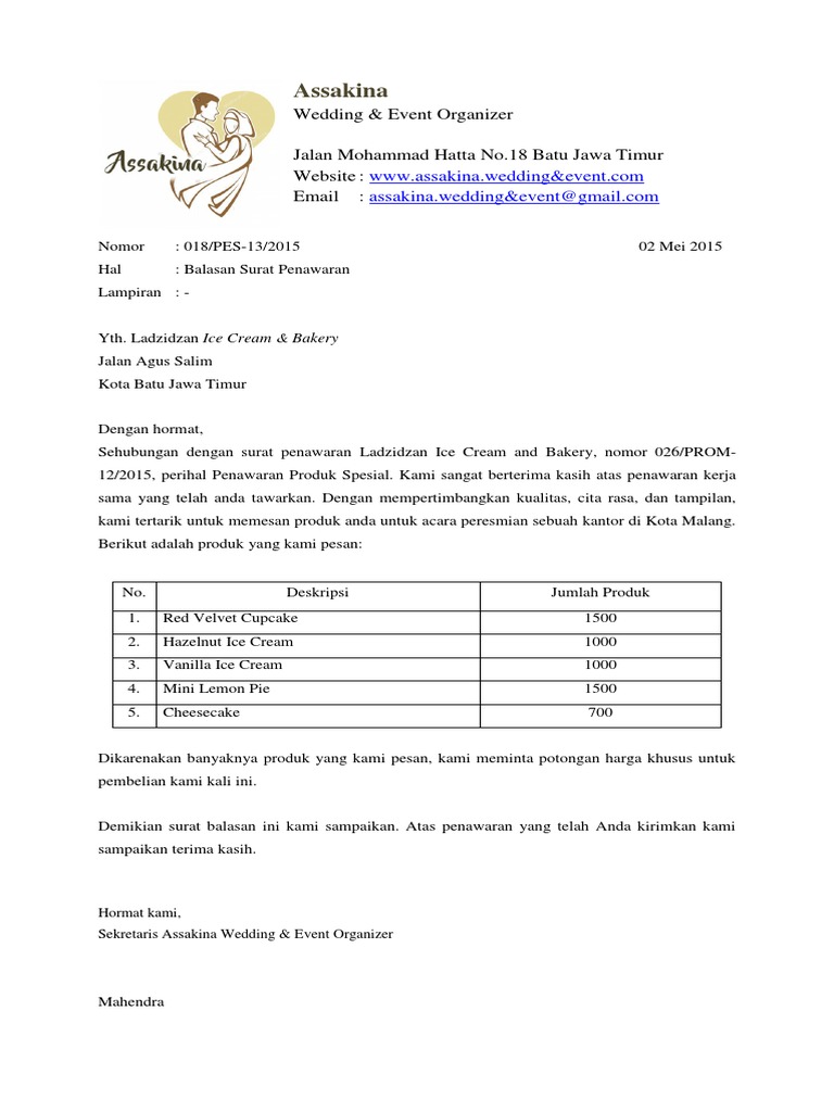 Setelah mempelajari dan memahami isi dokumen pengadaan serta mempelajari berita acara penjelasan , maka dengan ini. Contoh surat penawaran harga rumah, barang elektronik dan furniture. 10 contoh surat permohonan bantuan dana izin kerjasama dll. Bagian pembuat surat penawaran memberikan penjelasan singkat tentang beberapa hal umum. Dengan surat penawaran semacam ini bisa menjadi harapan untuk menjadi pembuka kerja sama antara melalui surat ini, kami ingin memberikan penawaran untuk jasa konsultasi bisnis perusahaan pt. Perusahaan yang ingin menjalin kerjasama dengan pihak lain membutuhkan adanya surat penawaran kerjasama yang berfungsi. Tak memandang usia, banyak dari mereka yang masih berusia remaja bahkan yang sudah tua juga menggeluti profesi. Surat penawaran kerjasama termasuk dalam surat resmi dan bagian dari komunikasi bisnis. Contoh surat penawaran banyak sekali, sehingga anda bisa menyesuaikan dengan bidang pekerjaan anda. Contoh surat permohonan kerjasama jasa travel. Surat balasan kerjasama merupakan salah satu contoh surat resmi yang dikeluarkan oleh karena merupakan surat resmi, maka surat balasan kerjasama ini harus diketik rapi pada kertas kop perusahaan serta membuat surat balasan. Demikian penjelasan lengkap mengenai contoh. Kerjasama yang dijalin adalah untuk mewujudkan tujuan perusahaan.