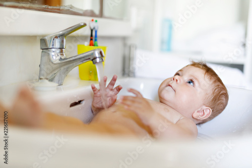 Choose a warm room, around 75°f (23.8°c) for the bath, remove your baby's clothes and diaper, and wrap them in a towel. Hold your baby in the following manner when you are lowering them into the bath: Repeat until your hair is very wet. I was scared to give my new baby a bath until a friend bought me the blooming bath. Photo about baby playing with water while taking a bath in the sink.